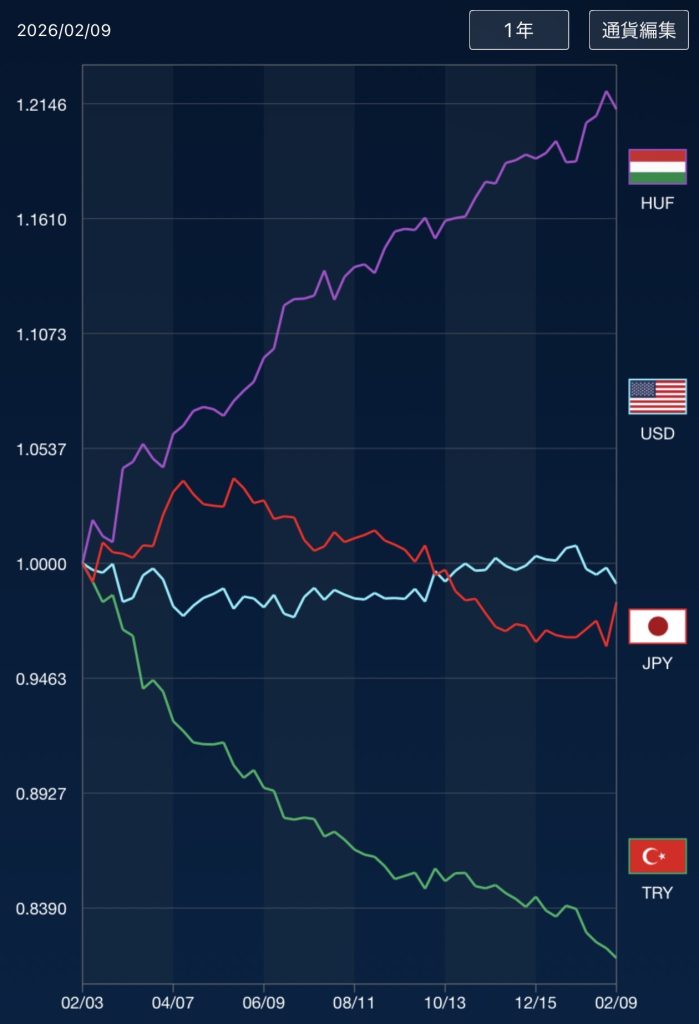 一方で「ハンガリーフォリント」はレートが非常に安定しているため、最近ポートフォリオに組み込みました!