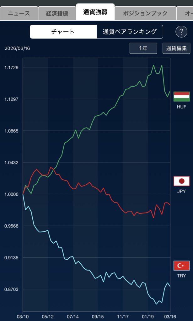 ▼直近1年の通貨強弱を見ると「円よりも強い」ため、スワップはもちろん、為替差益も期待できる通貨です。