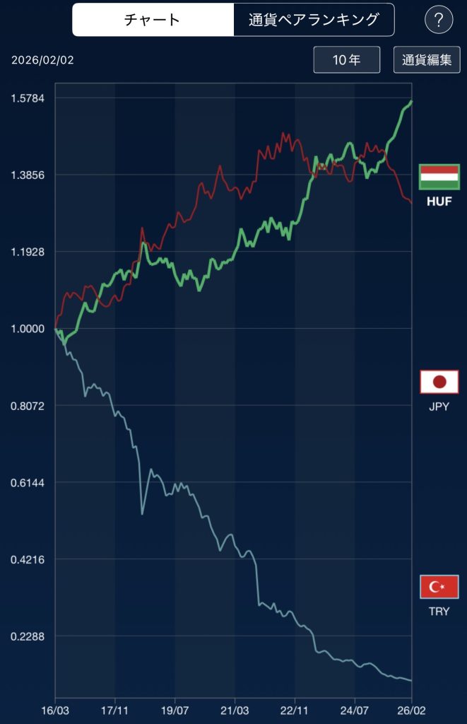 過去10年のレートを見ても、「ハンガリーフォリント」は「円」とほぼ互角です。