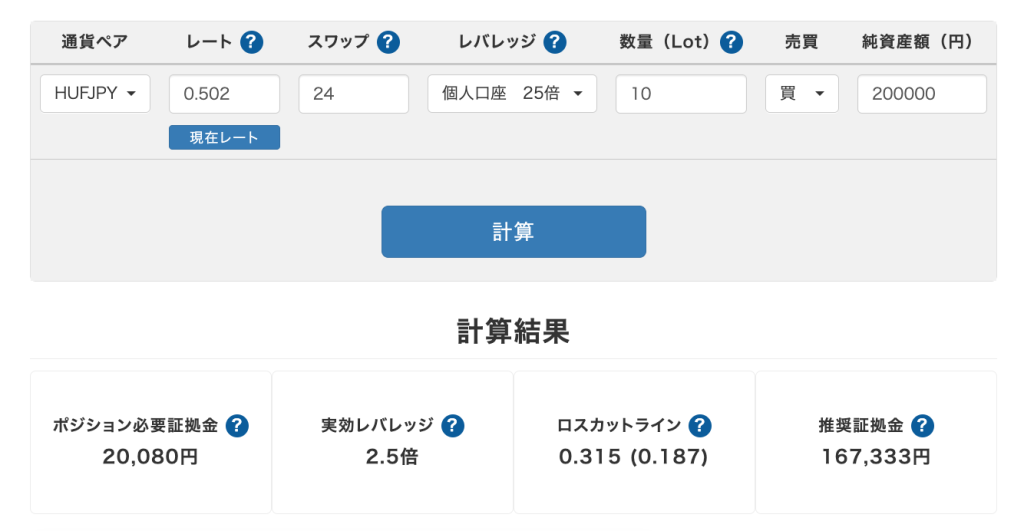 実際に、資金20万円でハンガリーフォリントを100万通貨(必要証拠金:17,800円)購入した場合のシミュレーションを行ってみたいと思います。