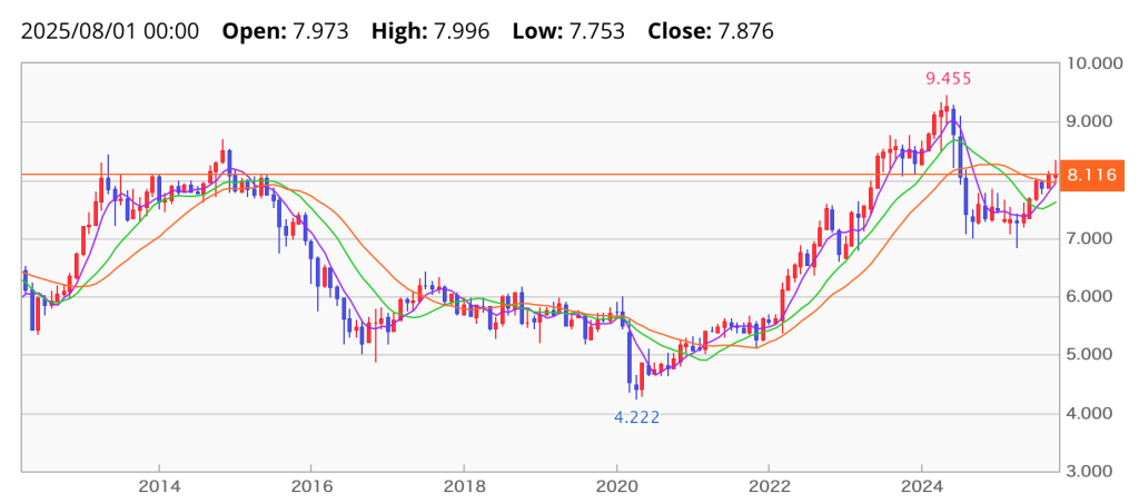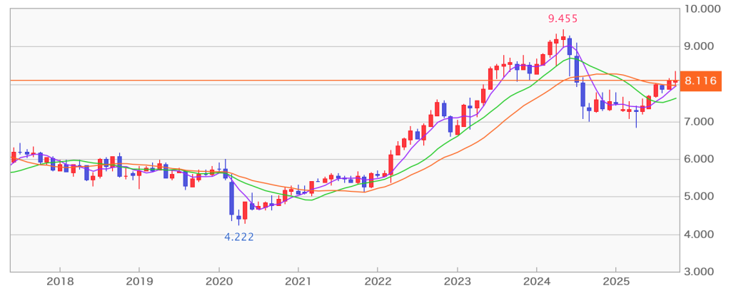 ちなみに、2023年以降は7円以上をキープしているので、そう簡単にロスカットにはならない水準だと思います。
