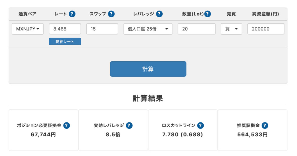 まず、スワップ投資で、最も注意したいロスカットライン(強制決済が発動する価格)は、結論「現在のレート8.5円 → 6.7円まで下落」した場合になります。