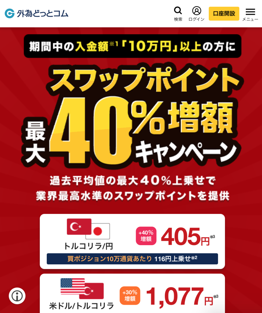 → トルコリラのスワップ40%増額中!10万通貨あたり「405円」