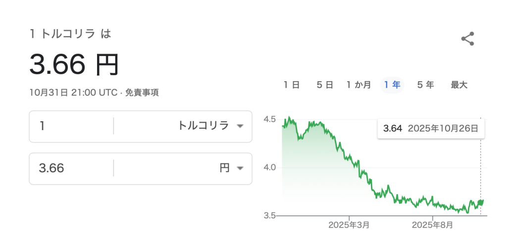 10年前は1リラ=約50円だったのですが、今や3円台まで下落しています。