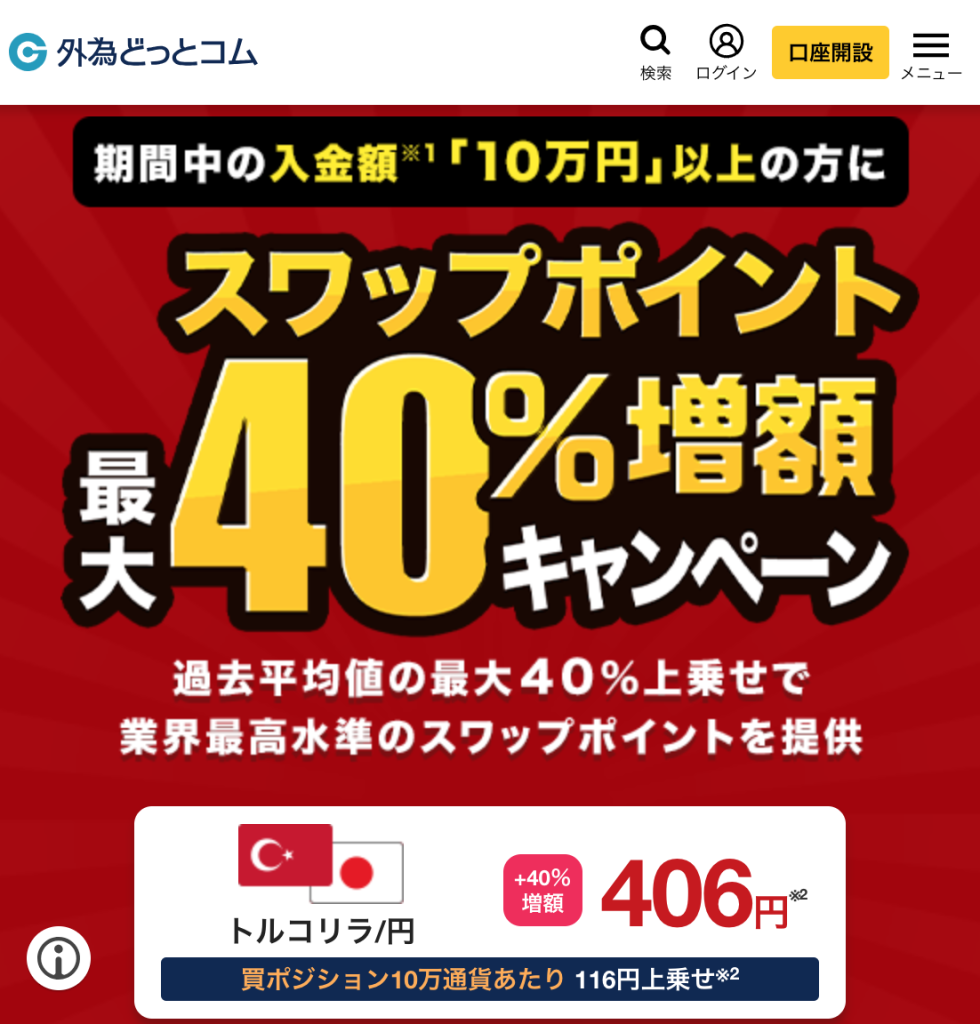 → トルコリラのスワップ40%増額中!10万通貨あたり「406円」
